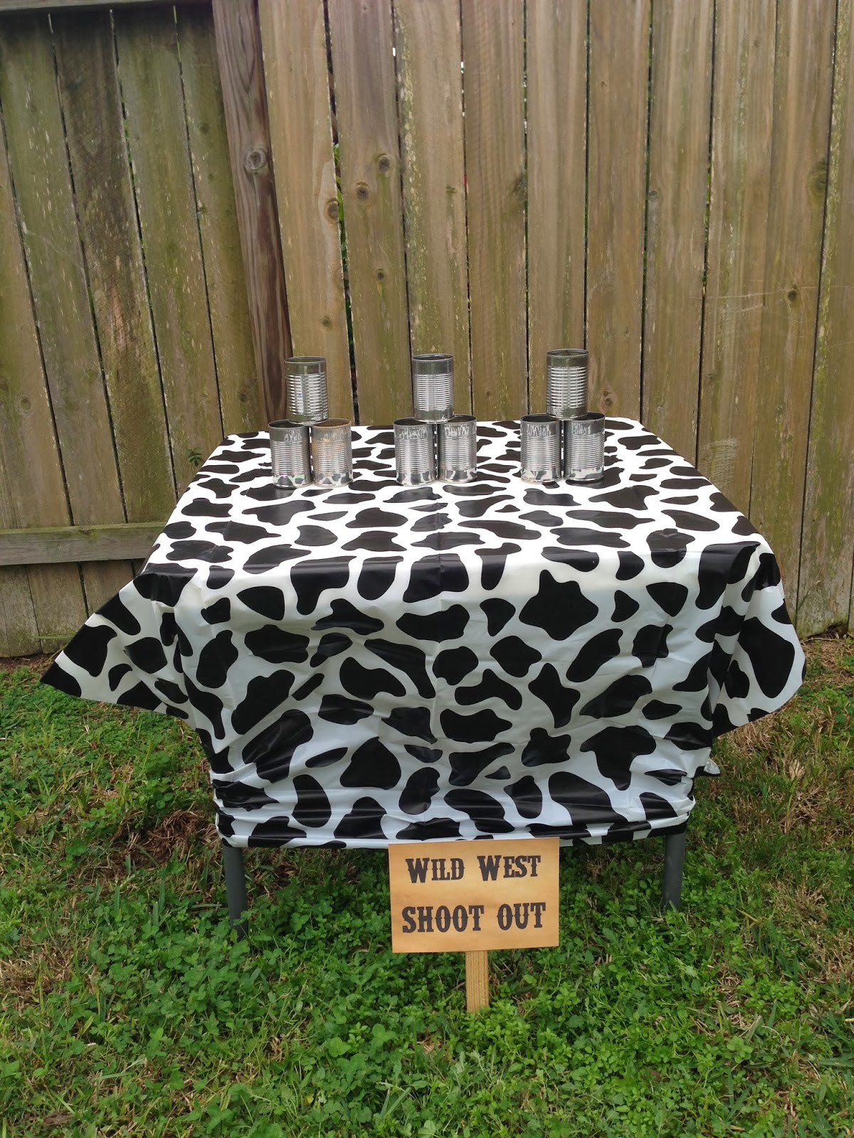 I tried to make the food as cowboy-themed as possible. Instead of paper plates I bought packages of tin pie plates from the dollar store. I wrapped the utensils in cow print napkins and tied them with twine, and stuck them in tin cans. I baked and served a cookie cake in a cast iron skillet. Little details like these make me incredibly happy. :) I already had the tablecloth and the wooden crates are from our playroom and I just turned them upside down and backwards. I bought them at Michael's last year for $6 each with coupons. I stained them and then stenciled on "TOYS" with a black sharpie. But the playroom makeover is a post for another day.